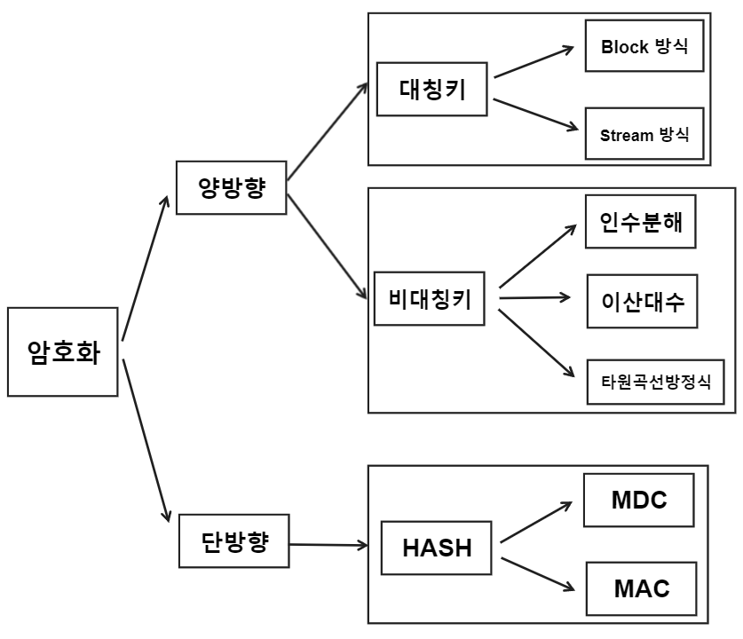 암호화 분류 양방향 암호화(대칭/비대칭 키)