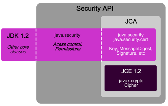 위 그림에서 보듯 JCA(java.security 패키지)와 JCE(javax.crypto 패키지)가 분리되어 있는 것을 알 수 있다. JDK1.4 이상부터 모두 기본으로 포함되어 있다.