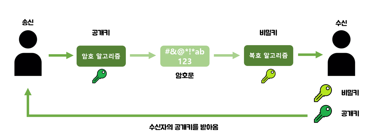 - 공개키는 누구나 알 수 있도록 공개된 키, 어떤 정보를 특정 사용자에게 보낼 때 해당 사용자의 공개키를 통해 정보를 암호화하여 전송합니다.