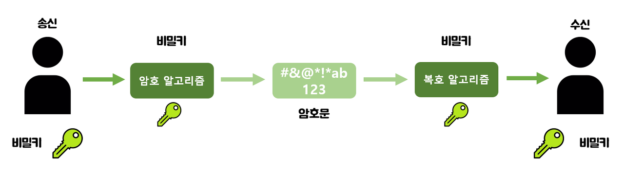 - 대칭 키: 같은 키를 이용하여 메시지를 암.복호화 하는 것