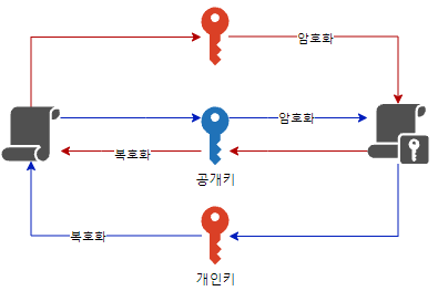 - 비대칭키 암호화에서는 공개 키와 개인 키 두 개의 키가 사용된다.