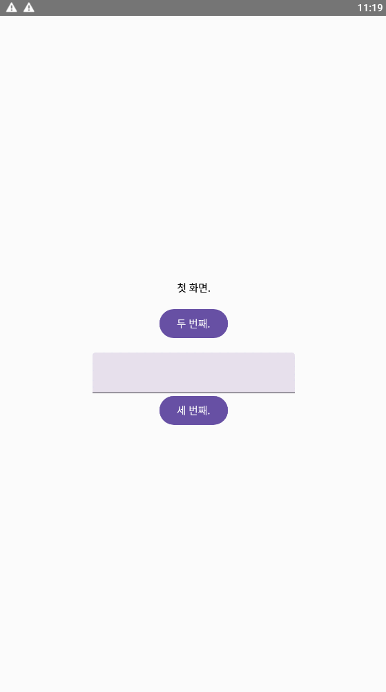 package com.example.navigation import android.os.Bundle import androidx.activity.ComponentActivity import androidx.activity.compose.setContent import androidx.compose.foundation.layout.Arrangement import androidx.compose.foundation.layout.Column import androidx.compose.foundation.layout.Spacer import androidx.compose.foundation.layout.fillMaxSize import androidx.compose.foundation.layout.height import androidx.compose.material3.Button import androidx.compose.material3.ExperimentalMaterial3Api import androidx.compose.material3.Text import androidx.compose.material3.TextField import androidx.compose.runtime.Composable import androidx.compose.runtime.mutableStateOf import androidx.compose.runtime.remember import androidx.compose.ui.Alignment import androidx.compose.ui.Modifier import androidx.compose.ui.unit.dp import androidx.navigation.NavController import androidx.navigation.compose.NavHost import androidx.navigation.compose.composable import androidx.navigation.compose.rememberNavController @ExperimentalMaterial3Api class MainActivity : ComponentActivity() { override fun onCreate(savedInstanceState: Bundle?) { super.onCreate(savedInstanceState) setContent { val navController = rememberNavController() NavHost( navController = navController, startDestination = "first", ) { composable("first") { FirstScreen(navController) } composable("second") { SecondScree(navController) } composable("third/{value}") { backStackEntry -> ThirdScreen( navController = navController, value = backStackEntry.arguments?.getString("value") ?: "", // backStackEntry 에서 넘겨져오는 값을 얻을 수 있다 ) } } } } } @ExperimentalMaterial3Api @Composable fun FirstScreen(navController: NavController) { val (value, setValue) = remember { mutableStateOf("") } Column( modifier = Modifier.fillMaxSize(), verticalArrangement = Arrangement.Center, horizontalAlignment = Alignment.CenterHorizontally, ) { Text(text = "첫 화면.") Spacer(modifier = Modifier.height(16.dp)) Button(onClick = { navController.navigate("second") }) { Text(text = "두 번째.") } Spacer(modifier = Modifier.height(16.dp)) TextField(value = value, onValueChange = setValue) Button(onClick = { if (value.isNotEmpty()) { navController.navigate("third/$value") } }) { Text(text = "세 번째.") } } } @Composable fun SecondScree(navController: NavController) { Column( modifier = Modifier.fillMaxSize(), verticalArrangement = Arrangement.Center, horizontalAlignment = Alignment.CenterHorizontally, ) { Text(text = "두번째 화면.") Spacer(modifier = Modifier.height(16.dp)) Button(onClick = { navController.navigateUp() /*navController.popBackStack()*/ }) { Text(text = "뒤로 가기.") } } } @Composable fun ThirdScreen(navController: NavController, value: String) { Column( modifier = Modifier.fillMaxSize(), verticalArrangement = Arrangement.Center, horizontalAlignment = Alignment.CenterHorizontally, ) { Text(text = "세 번째 화면.") Spacer(modifier = Modifier.height(16.dp)) Text(text = value) Button(onClick = { navController.navigateUp() }) { Text(text = "뒤로 가기!") } } }완성된 화면