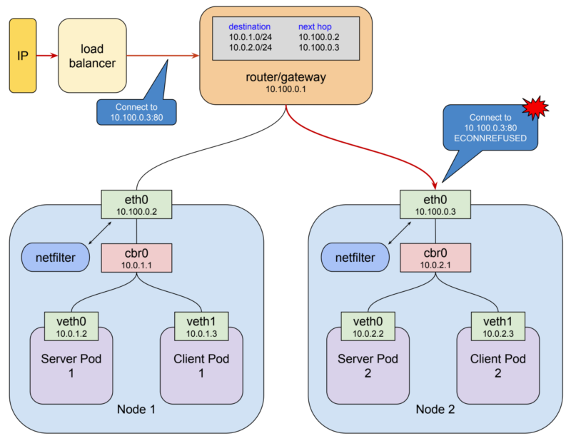 이렇게 설정한다면 실제로 잘 동작할 것이다. 클라이언트에서 Service IP를 호출하면 정의된 라우팅 규칙에 따라 특정 Node 에 전달이 되고 그 Node 의 네트워크 interface 에서는 기존과 같이 netfilter 를 이용하여 원하는 Pod 로 전달이 될 것이다. 이 방법은 괜찮아 보이지만(비록 가정이긴 하지만) 사실 큰 문제점을 가지고 있다.