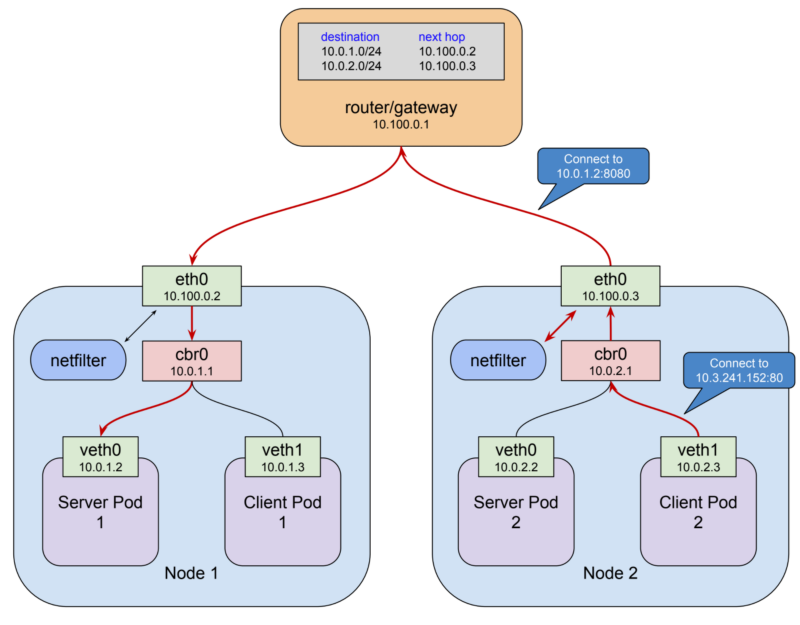 연결과 요청은 OSI Layer 4(tcp)나 Layer 7(http, rpc, etc)에서 동작한다. Netfilter 라우팅 규칙은 IP packet 레벨인 Layer 3 에서 동작한다. netfilter 를 포함한 모든 라우터는 라우팅 결정을 IP packet 기준으로 한다. 일반적으로 어디서부터 왔고 어디로 가야하는지를 의미한다. 이것을 Layer 3 의 용어를 사용해서 설명 한다면 10.3.241.152:80 서비스로 향하는 모든 패킷이 각 노드의 eth0 interface 에 도착하게 되면 netfilter 가 규칙에 따라 해당 패킷을 Pod 로 전달한다.