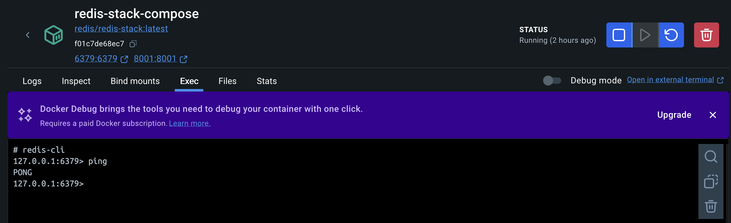 정말 다행이게도 Docker Desktop은 내가 생성한 Docker Container 내부에 명령어를 실행할 수 있는 터미널을 제공하고 있다.